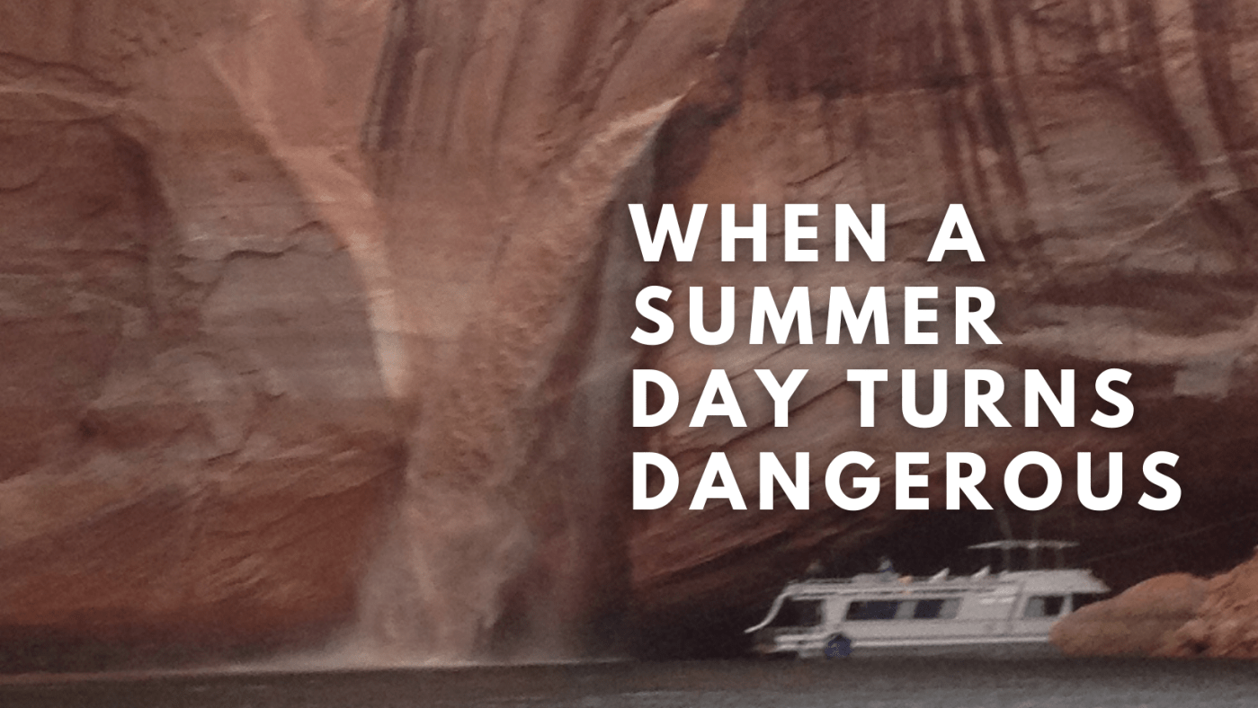 I was too focused on snapping the cover down to see anything beyond the walls spinning in front of me as the boat tossed about in the current. Spouts of water appeared from the high edges above us (sometimes out of the wall itself). I barely heard the crack of thunder but I sure heard the yells of my family, “Move the boat, move the boat.” My dad gunned it just as the waterfall exploded, spraying water and mud across our hull. (The houseboat isn’t us).